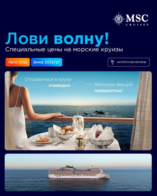 Бронируйте круизы из определенного ассортимента сезонов «Лето 2026» и «Зима 2026/27» (с отправлениями по декабрь 2026) по специальным ценам!